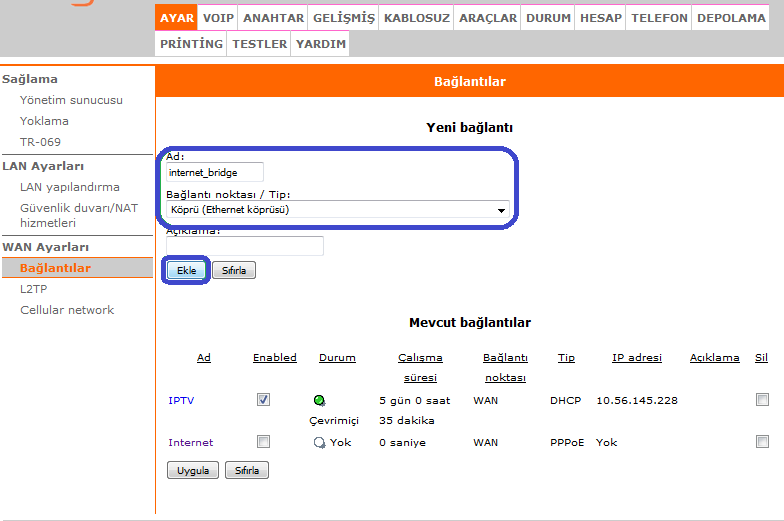 - Bağlantılar ekranında, üst kısımda Yeni bağlantı başlığı altında Ad kısmına istediğiniz bir isim girdikten sonra Bağlantı noktası kısmında Köprü(Ethernet köprüsü) seçeneğini seçerek Ekle butonuna tıklayınız. Yeni bir bağlantı noktası oluşturmuş olacaksınız.