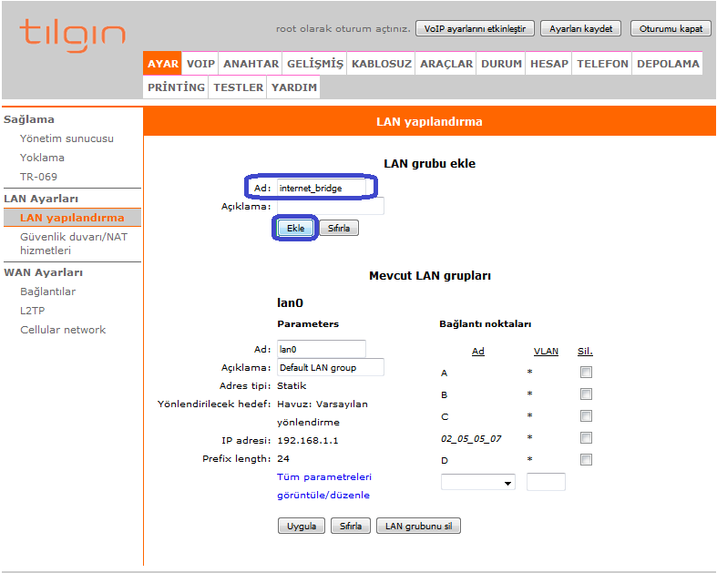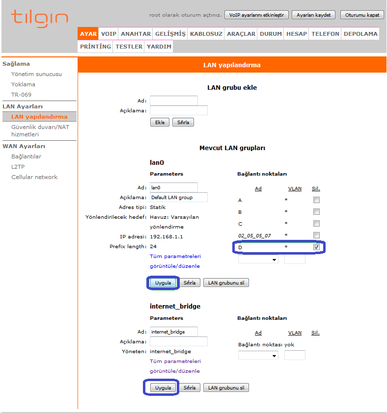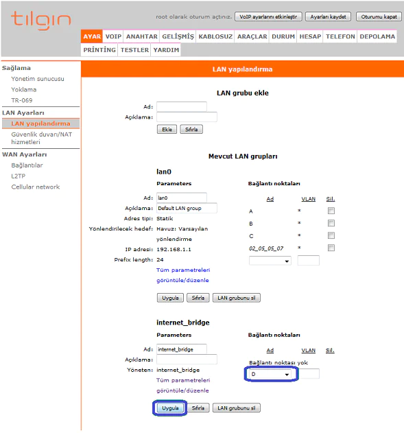 - Ayar ⟶ LAN ayarları ⟶ LAN yapılandırma sayfasını açıp ‘internet_bridge’ LAN grubu için kullanılacak fiziksel port için, önce var olan lan0 grubunda D portu silip, oluşturduğumuz ‘internet_bridge’ grubuna D portunu ekleyelim.