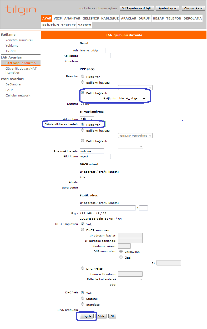 - İşlemler tamamlandığında ‘internet_bridge’ LAN grubu ve bağlantı sayfaları aşağıdaki ekran görüntülerinde olduğu gibi görünecektir. Ayarları kaydet butonuna tıklayarak kurulumu tamamlayabilirsiniz.