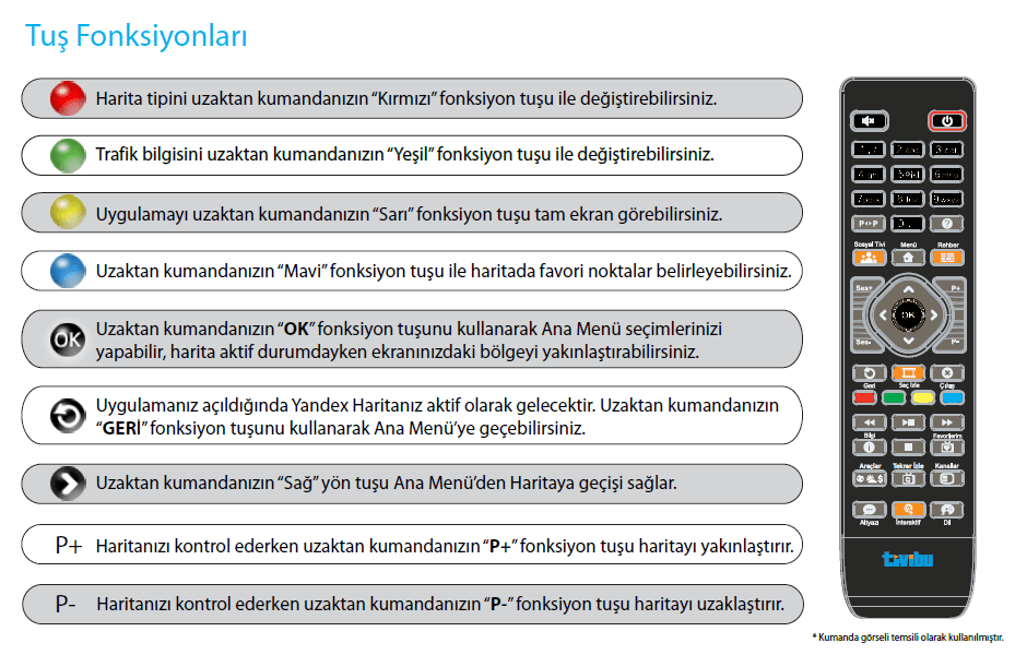- Kumandamızın da yardımı ile P+ ve P– tuşları ile harita üzerinde gezinebilir, yakınlaştırıp uzaklaştırabiliriz.