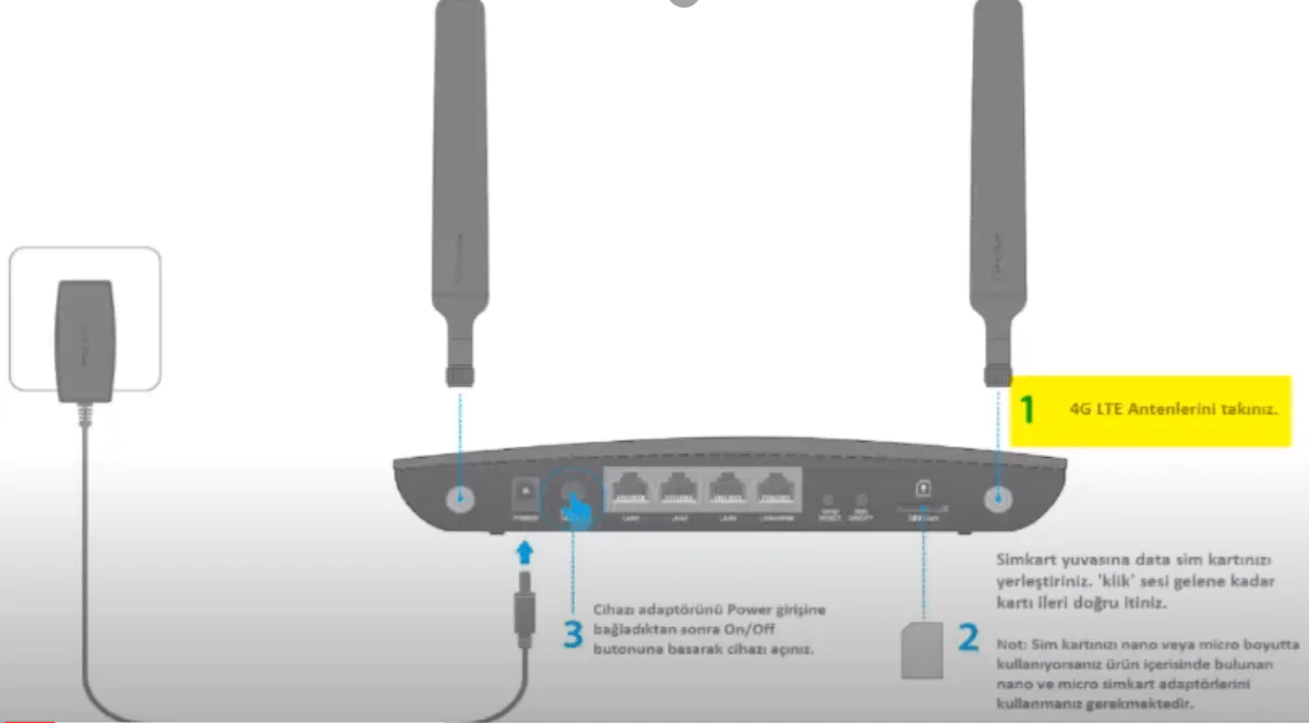 2 – Simkart yuvasına data sim kartınızı yerleştiriniz. ‘klik’ sesi gelene kadar kartı ileri doğru itiniz Not : sim kartınızı nano veya micro boyutta kullanıyorsanız ürün içerisinde bulunan nano ve micro sim kart adaptörlerini kullanmanız gerekmektedir
