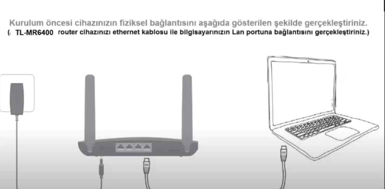 kurulum öncesi cihazınızın fiziksel bağlantısını aşağıda gösterilen şekilde geçerkleştiriniz . ( TL – Mr6400 router cihazınızı ethernet kablosu ile bilgisayarınızın lan portuna bağlantısını gerçekleştiriniz )