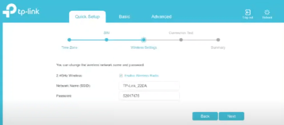 bu karşımızdaki sayfada ise kablosuz ağ ayarlarımızı yapılandırabiliyoruz network name (SSID) yazan kısma kablosuz ağ adımızı Password yazan kısma ise kablosuz ağ şifrenizi yazarak oluşturabilirsiniz veyada standart halinde bırak fabrıka çıkış kablosuz ağ adı ve şifreyide kullanabilirsiniz işleminizi tamamladıktan sonra next butonuna tıklayalım