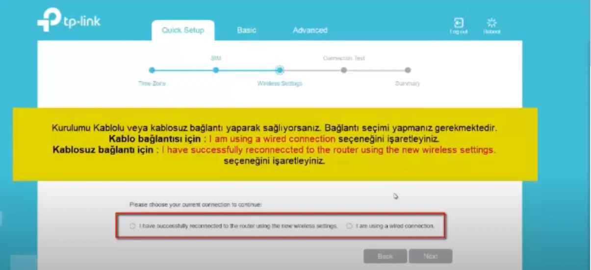 kurulumu kablolu olarak yaptıysanız I am using a wired connection seceneğini işaretliyoruz kablosuz olarak yaptıysanız I have successfully reconneccted to the router using the new wireless settings seçeneğini işaretliyeniz ve next butonuna tıklayınız bir sonraki sayfada success yazısını gördükten sonra next e tıklayalım daha sonrasında finish butonuna basarak kurulum işlemini tamamlayım .