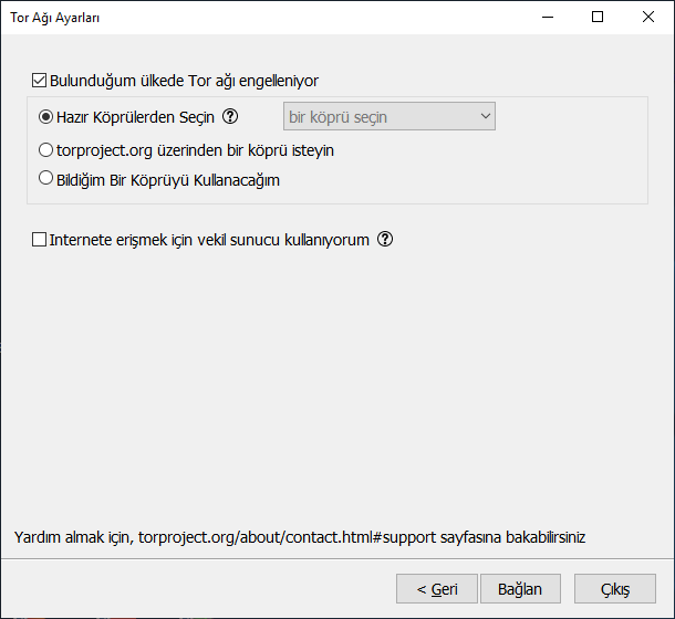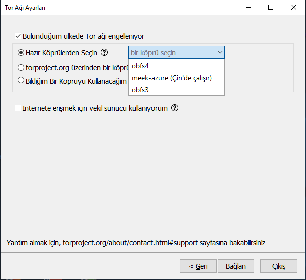 • ‘Hazır Köprülerden Seçin’ seçeneğini seçerek ilerleyebilirsiniz. Bu seçeneği seçtiğinizde sunulan seçeneklerden obfs 4 veya obfs 3 seçeneklerinden birini seçebilirsiniz (Daha önceki denemelerimizde obfs 4 bridge –köprü– seçeneğinin daha hızlı olduğunu deneyimledik).