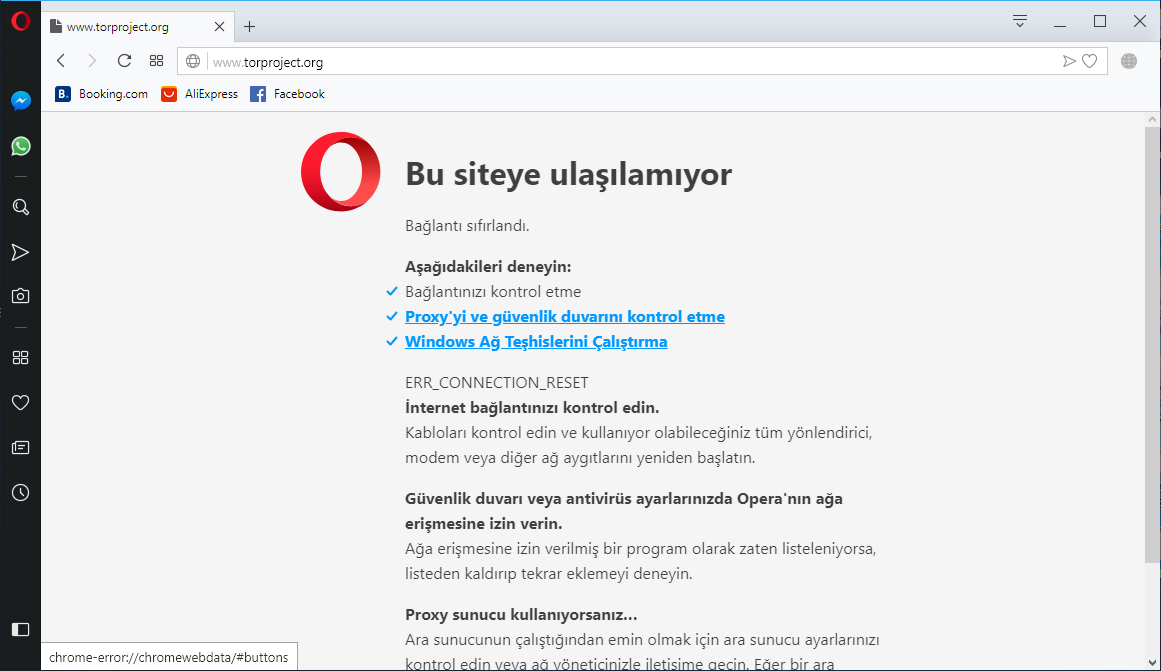 • Arama sonuçlarında en üstteki https://www.torproject.org/ linkine tıklıyoruz. VPN’i etkinleştirmediğimizde, gördüğünüz gibi Tor web sayfasına erişemiyoruz.