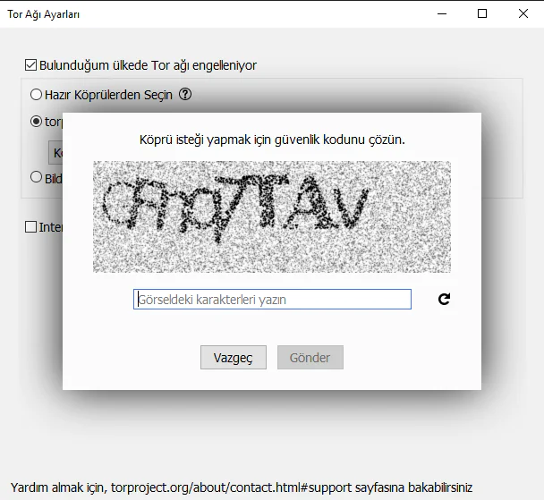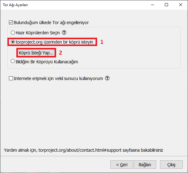 • Makalemizde seçenek yani ‘torproject.org üzerinden bir köprü isteyin’ seçeneği üzerinden ilerleyeceğiz. Bu seçeneği seçtikten sonra, bu seçeneğin hemen altında beliren ‘Köprü İsteği Yap…’ butonuna tıklıyoruz.