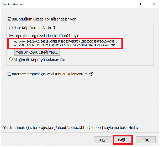 • org üzerinden köprü (bridge) IP adresleri gönderildikten sonra ‘Bağlan’ butonuna tıklıyoruz.