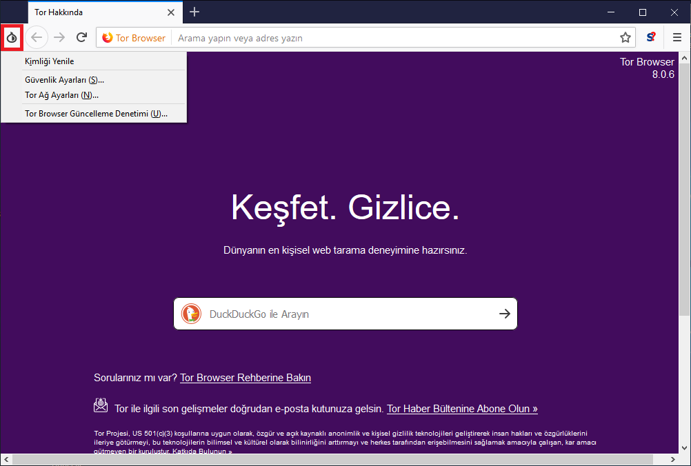 • Sol üst köşedeki soğan simgesine tıklayarak güvenlik ayarlarınızı, ağ ayarlarınızı denetleyebilir ve değiştirebilirsiniz. Ve ayrıca tarayıcınızın güncellemelerini denetleyebilirsiniz ve güncelleme gelmiş ise, tarayıcınızı güncelleyebilirsiniz.