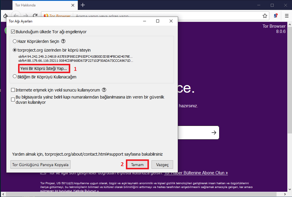 • Ağ ayarlarınızı (köprü -bridge- IP adreslerini) değiştirmek isterseniz, ‘Tor Ağ Ayarları…’ menüsüne tıklayıp, açılan pencerede ‘Yeni Bir Köprü İsteği Yap…’ butonuna tıklayabilir ve yeni köprü (bridge) IP adresleri edinebilirsiniz.