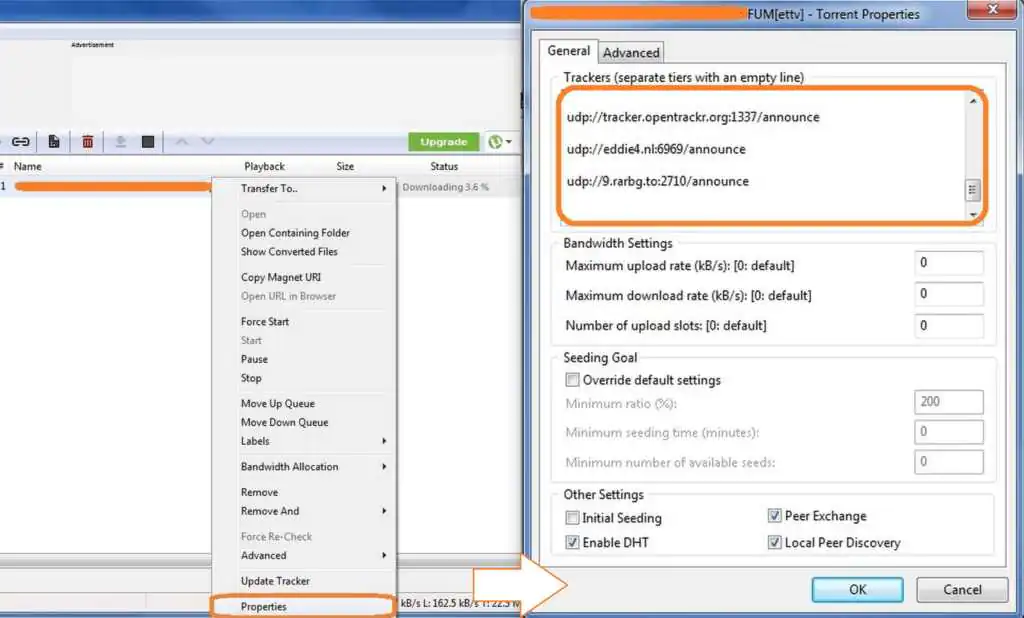 ‘Trackers’ seçeneği, Torrent indirme hızını optimize etmek için iyi bir yoldur. Mevcut torrentlerinize yeni ve daha hızlı ‘trackers’ ekleyerek indirme hızını artırabilirsiniz. Torrentinize ‘trackers’ ekleme yöntemi karmaşık değildir. Yeni ‘trackers’ eklerken, mevcut ‘trackers’ linklerini silmediğinizden emin olun ( ‘trackers’ sayısını çoğaltma konusunda endişe etmeyin).