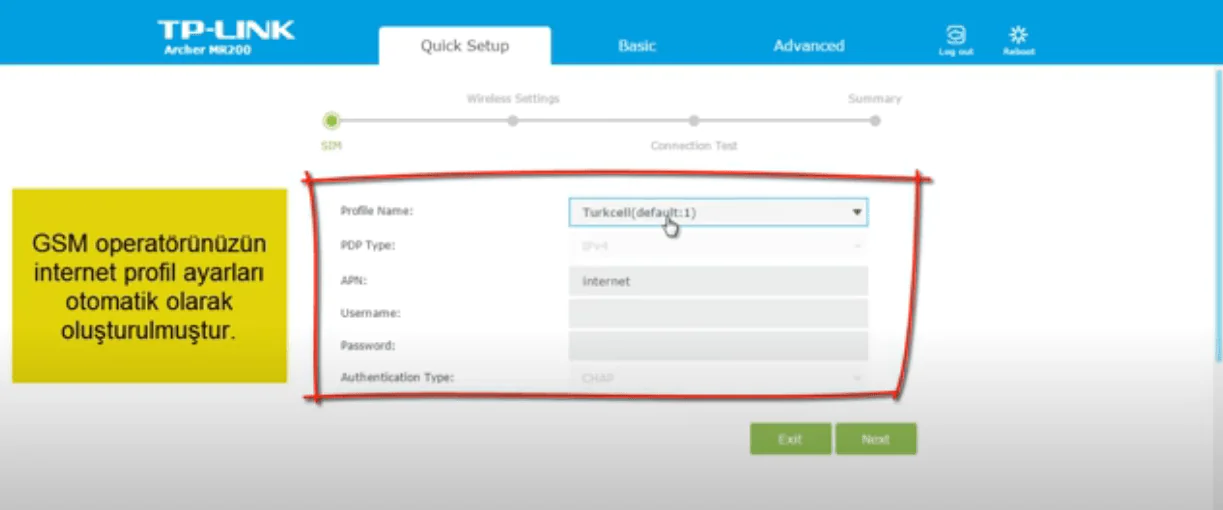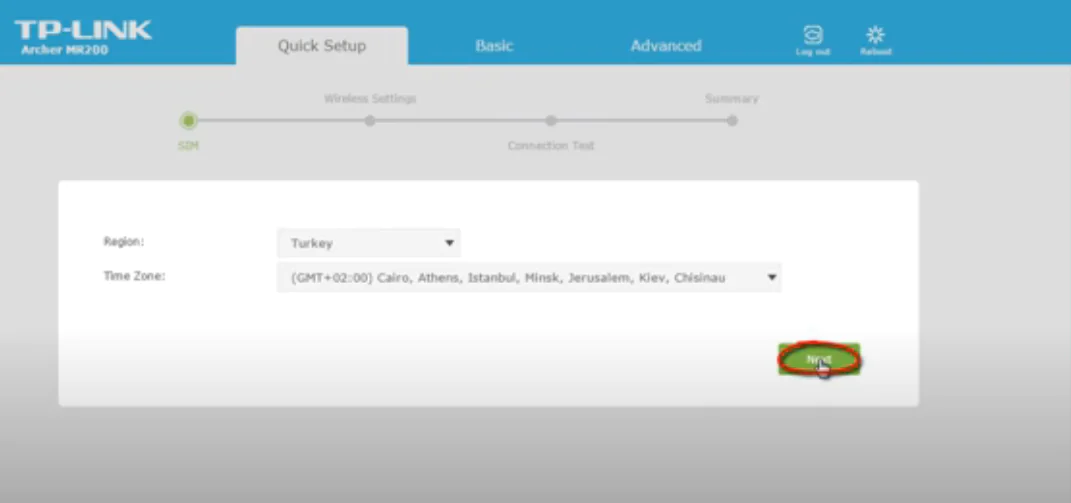 daha sonrasında yukarıdan quick setup seceneğine tıklayalım region kısmı Turkey secelim time zone kısmınıda GMT +02:00 secip next tıklayalım daha sonrasında gsm operatörünüzün internet profil ayaları mr200 cihazı tafından otomatik olarak oluşturulmaktadır .