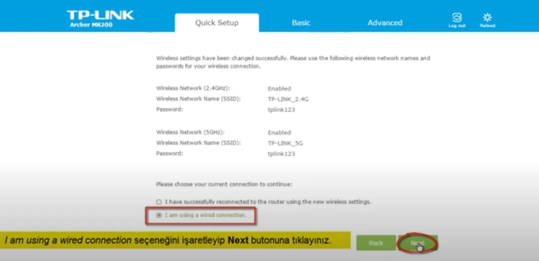 next tıklayalım gelen ekrandan kablosuz ayarlarınızı yapılandırabilirsiniz isteğiniz doğrultusunda . daha sonrsında next butonuna tıklayalım