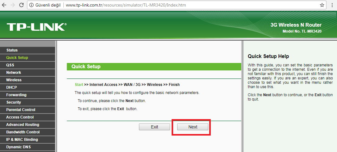 • Açılan sayfada ‘Quick Setup’ işlem adımları bilgisi gelecektir; bu ilk sayfada ‘Next’ butonuna tıklayalım.