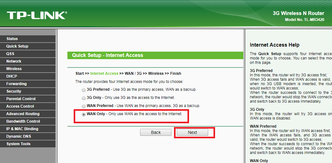 • Açılan ‘Quick Setup – Internet Access’ başlıklı sayfada ‘internet erişim modu’ seçimi yapılması gerekiyor. Biz DSL erişim modunu kullanacağımız için ‘WAN Only’ seçeneğini seçerek ‘Next’ butonuna tıklıyoruz.
