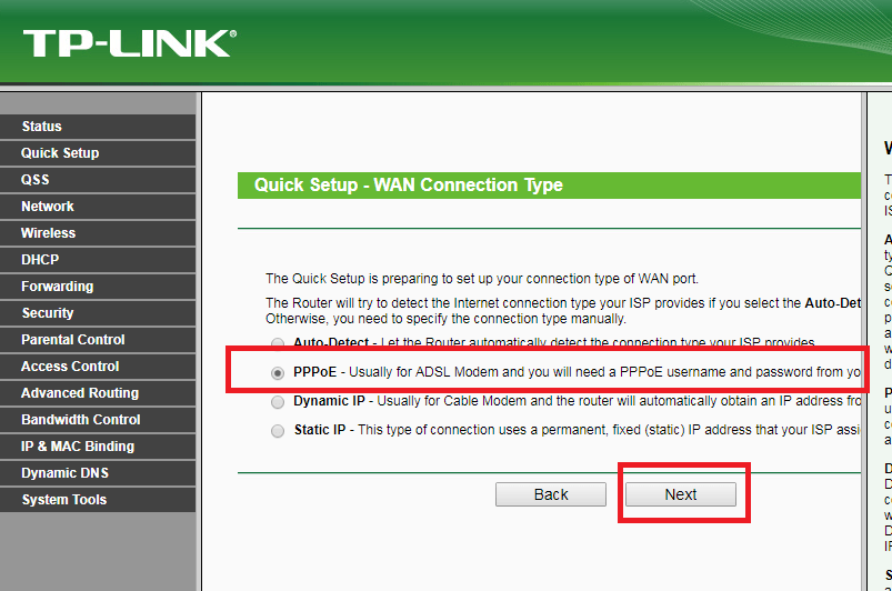 • Açılan ‘Quick Setup – WAN Connection Type’ başlıklı sayfada ‘PPPoE’ seçeneğini işaretleyerek ‘Next’ butonuna tıklıyoruz.