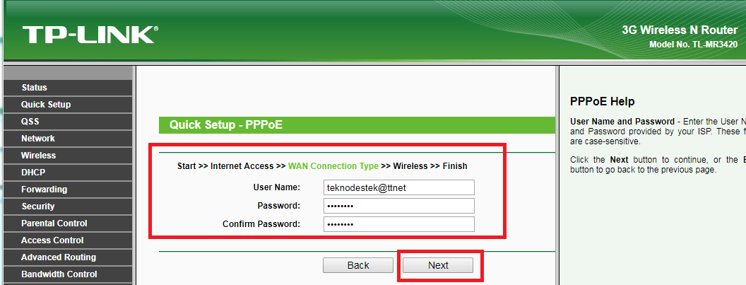 • Açılan ‘Quick Setup – PPPoE’ başlıklı sayfada, ‘User Name’, ‘Password’, ‘Confirm Password’ kutucuklarına, servis sağlayıcınızın verdiği ‘ADSL Kullanıcı Adı’ ve ‘ADSL Şifre’ bilgilerinizi yazarak ‘Next’ butonuna tıklayalım.