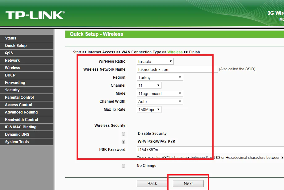 • ‘Wireless Security’ başlığı altında ‘WPA-PSK/WPA2-PSK’ seçeneğini seçtikten sonra ‘PSK Password’ kısmına Türkçe karakter ve boşluk içermeyen ve en az 8 karakterden oluşan bir ‘kablosuz ağ şifresi’ yazalım ve ‘Next’ butonuna tıklayalım.