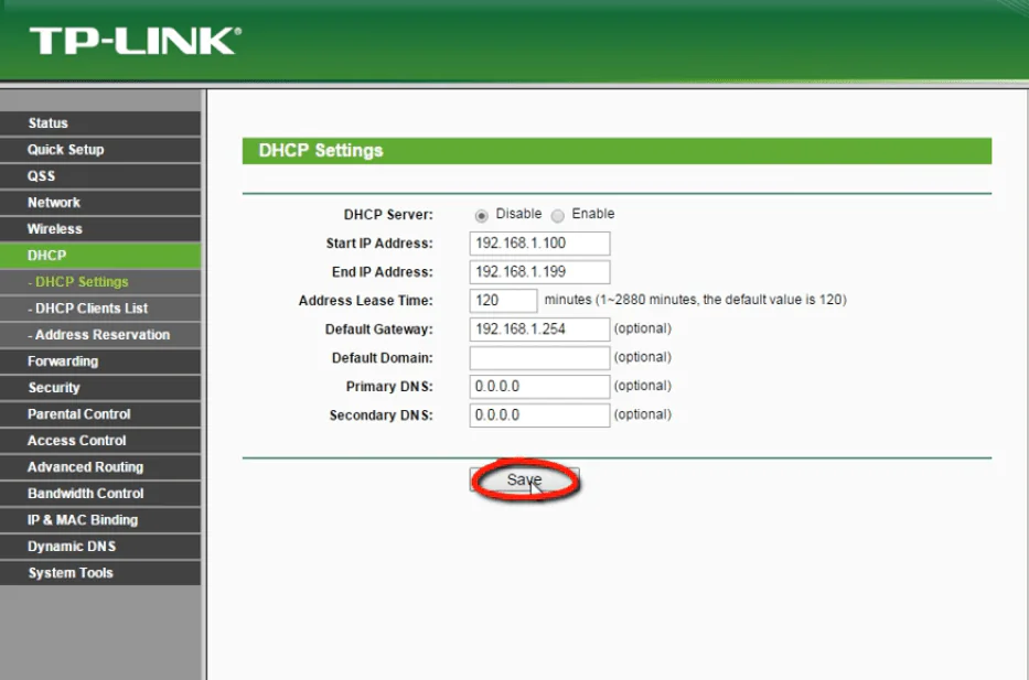 - Gelen menüde ise DHCP devre dışı bırakmanız için DHCP Server kısmında Disable butonunu işaretleyerek Save butonuna tıklayınız.