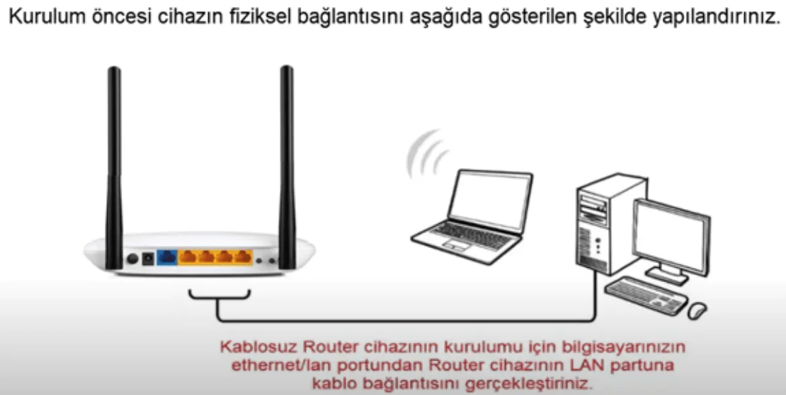 kablosuz router cihazının kurulumu için bilgisayarınızın ethernet/lan portundan router cihazının lan portuna kablo bağlantısını gerçekleştiriniz.