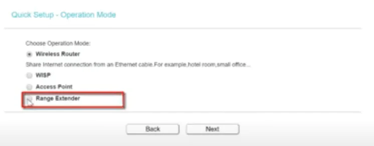 gelen kısımdan range extender ( genişletici modu ) modunu seçerek next butonuna tıklayalım