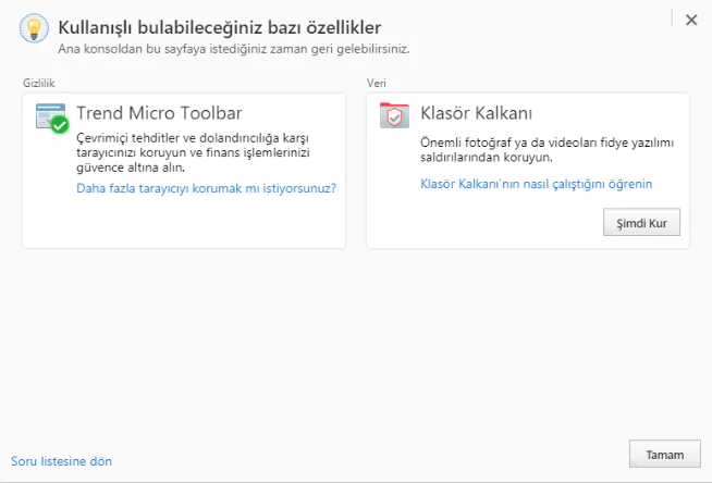 Artık arka planda program sürekli tarama yaparak bilgisayarınızı koruma altına alacak. Trend Micro size farklı özelliklerinden yararlanma imkanı da sunmakta. Bunlardan da isterseniz yararlanarak korumanızı artırabilirsiniz. Tarayıcınıza toolbar ekleyebilir veya ekstra klasör kalkanını kullanarak önemli dosyalarınızı koruyabilirsiniz.