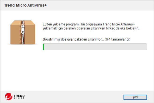 Öncelikle tarayıcımızdan bir sayfa açarak https://files.trendmicro.com/products/Titanium/17.0/Global/10292020/TrendMicro_17.0_EL_Full.exe bu linke giriş yaparak exe dosyasını indirip çalıştırıyoruz. Karşımıza aşağıdaki ekran gelecek. Yüzdelik dilim doluncaya kadar bekleyelim.
