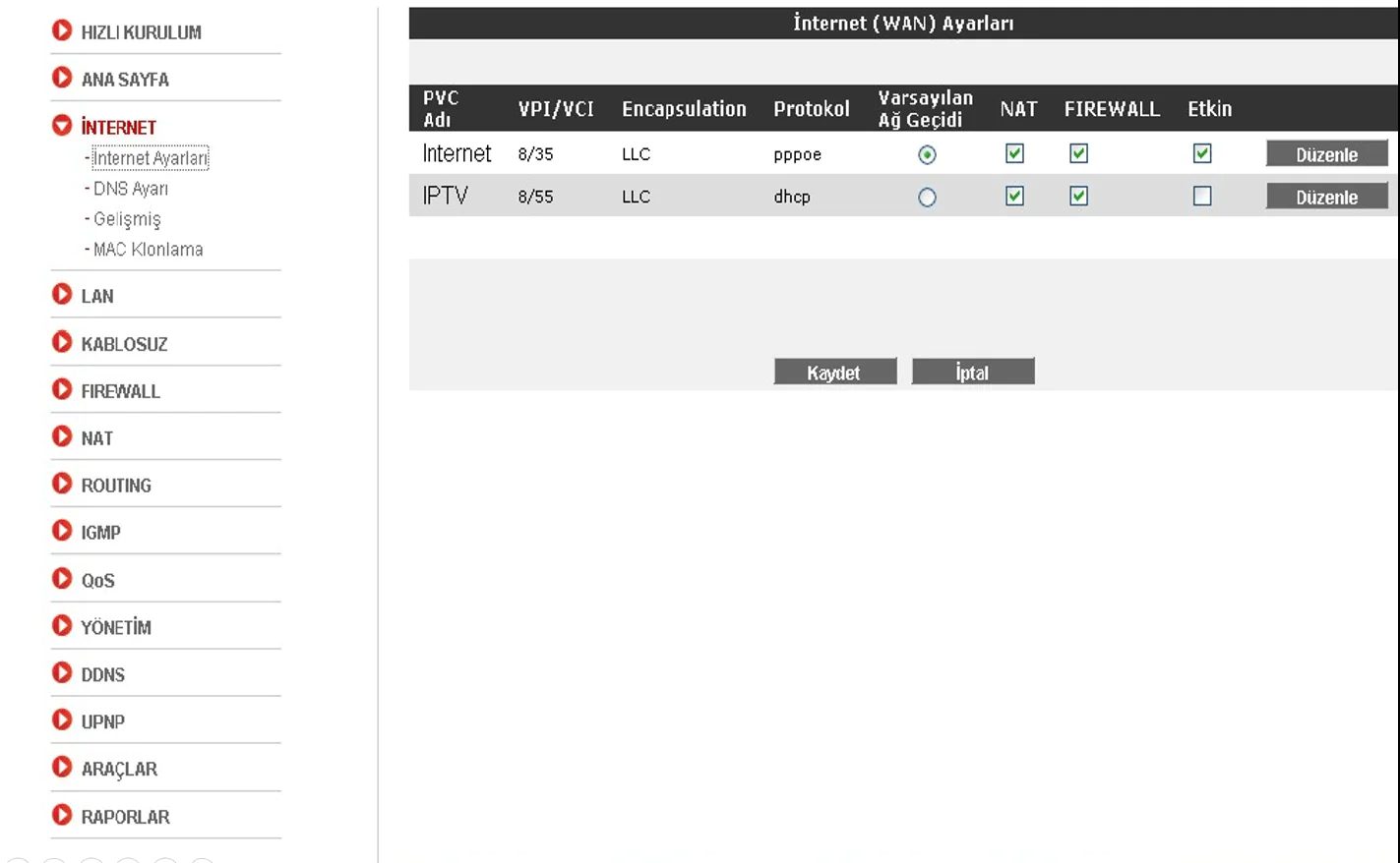 • Ekrana gelen sayfadaki tabloda PVC Adı, İnternet olan satırın sonundaki Düzenle butonuna tıklayalım.
