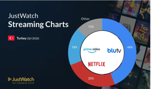 Türkiye’de kullanılan VOD (seç-izle) platformlarının dağılıma baktığımızda şaşırtıcı bir tabloyla karşılaşıyoruz. Herkesin son günlerde en sık karşılaştığı Netflix ‘ in birinci olduğunu düşünmesine rağmen yapılan araştırmalarda en çok kullanıcıya sahip olan platformun Blutv olduğu görünmektedir. Kullanıcı sayısı %44 olan Blutv bu oranla liderliği üstlenmekte ve her geçen gün kullanıcı sayısı artış göstermektedir. 2. sırayı ise %25 lik oranıyla Netflix alırken %18 ile Prime Video 3. sırada karşımıza çıkıyor.