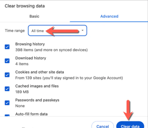 - Görüntülenen iletişim kutusunda, zaman aralığı seçenekleri açılır menüsünden Tüm zamanlar’ı seçin. Altındaki seçeneklerden Gözatma geçmişi, Çerezler ve diğer site verileri ve Önbelleğe alınmış görseller ve dosyalar’ın seçili olduğundan emin olun.