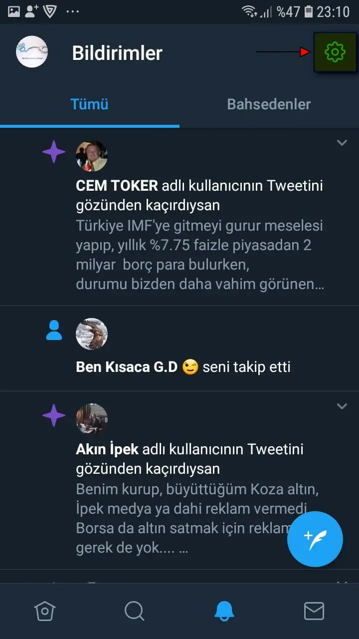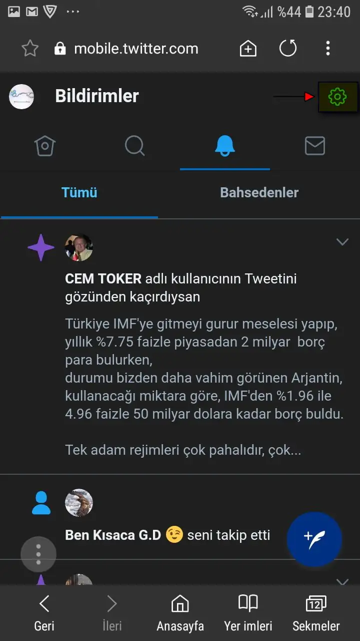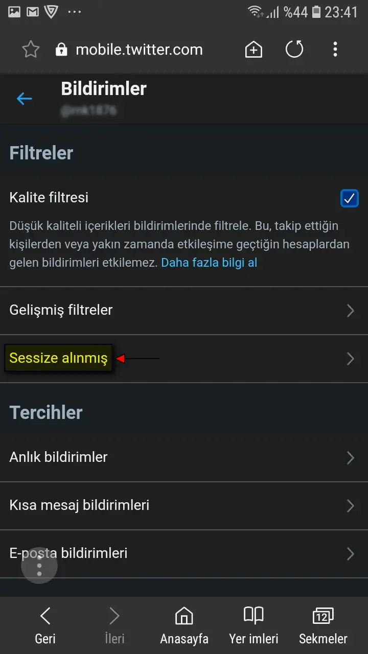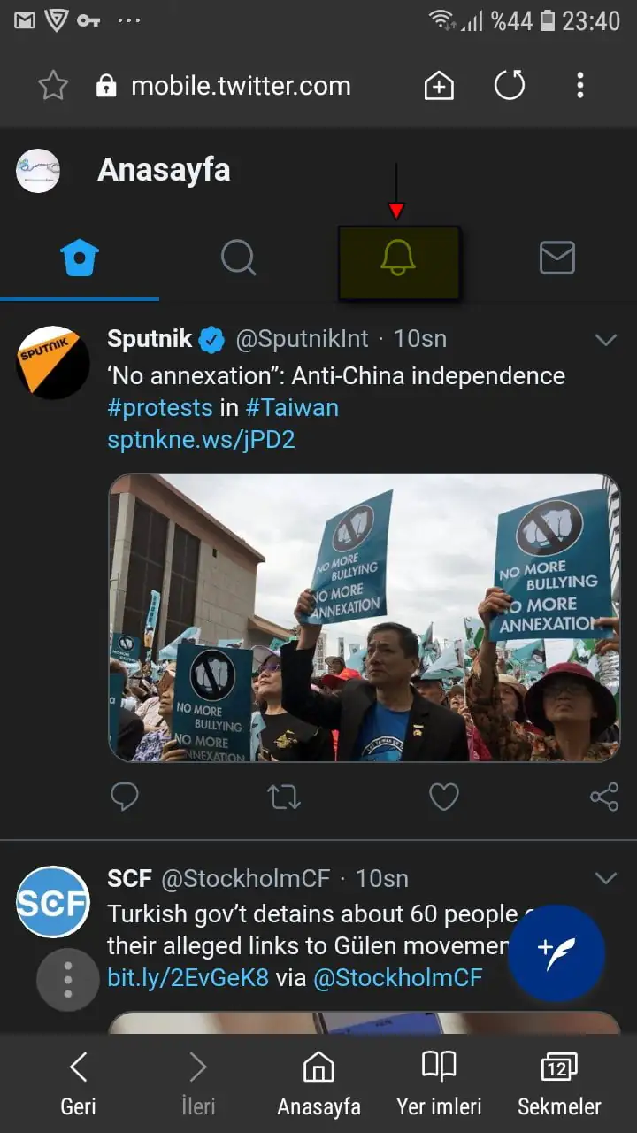 • Mobil tarayıcıdan (Samsung Mobil Tarayıcı, Safari, Chrome, Opera, Firefox) https://mobile.twitter.com/ sayfasını açıyoruz ve Twitter hesabımıza giriş yaptıktan sonra sayfanın üst kısmındaki ‘Bildirimler’ simgesine dokunuyoruz.