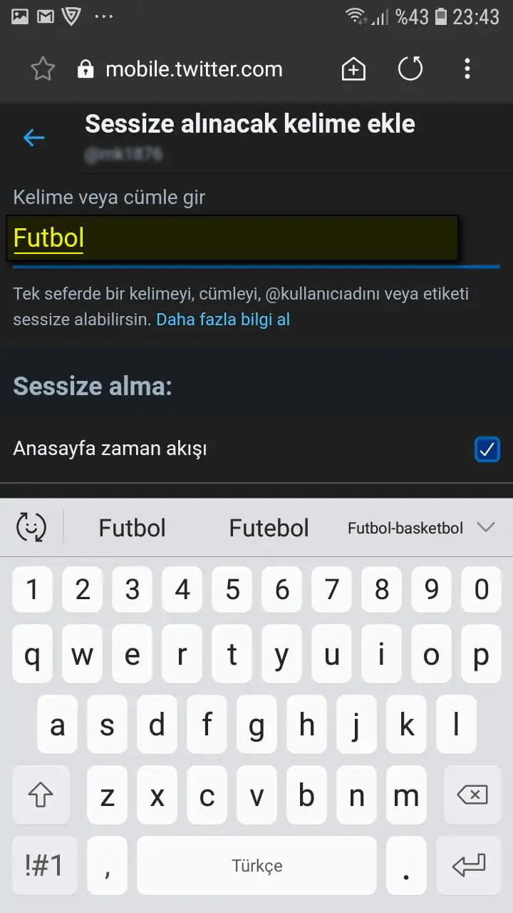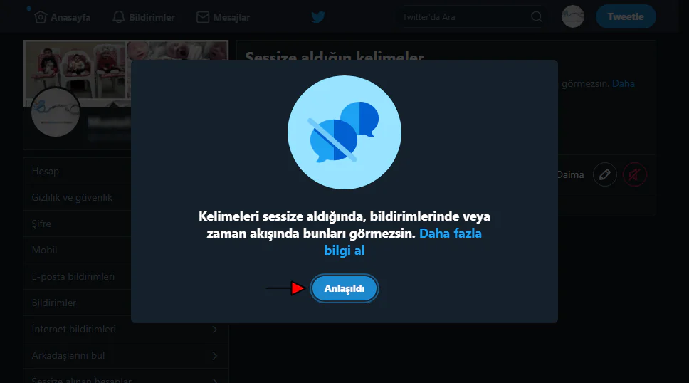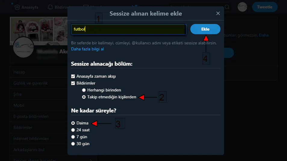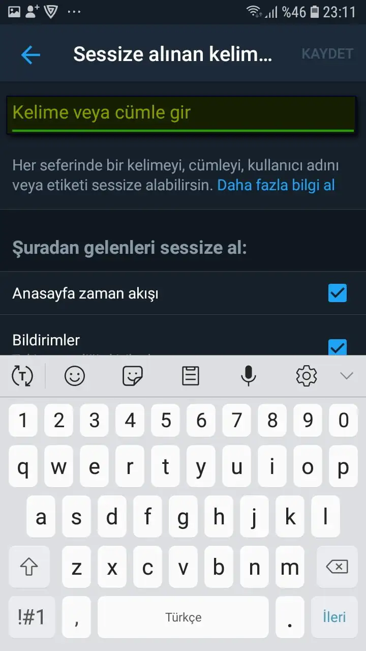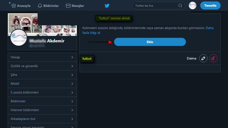 • Daha sonra bu kutucuğa, sessize almak (engellemek) istediğimiz kelimeyi yazıyoruz.