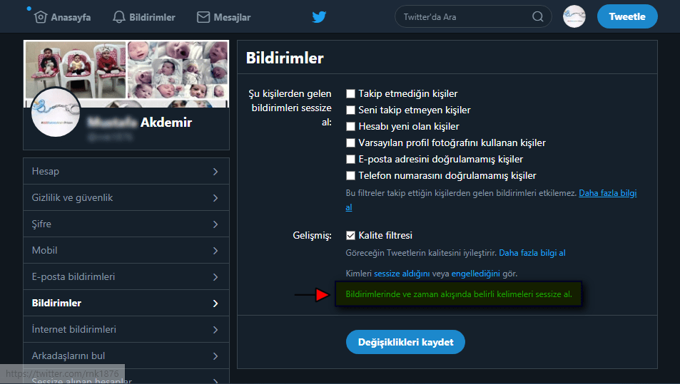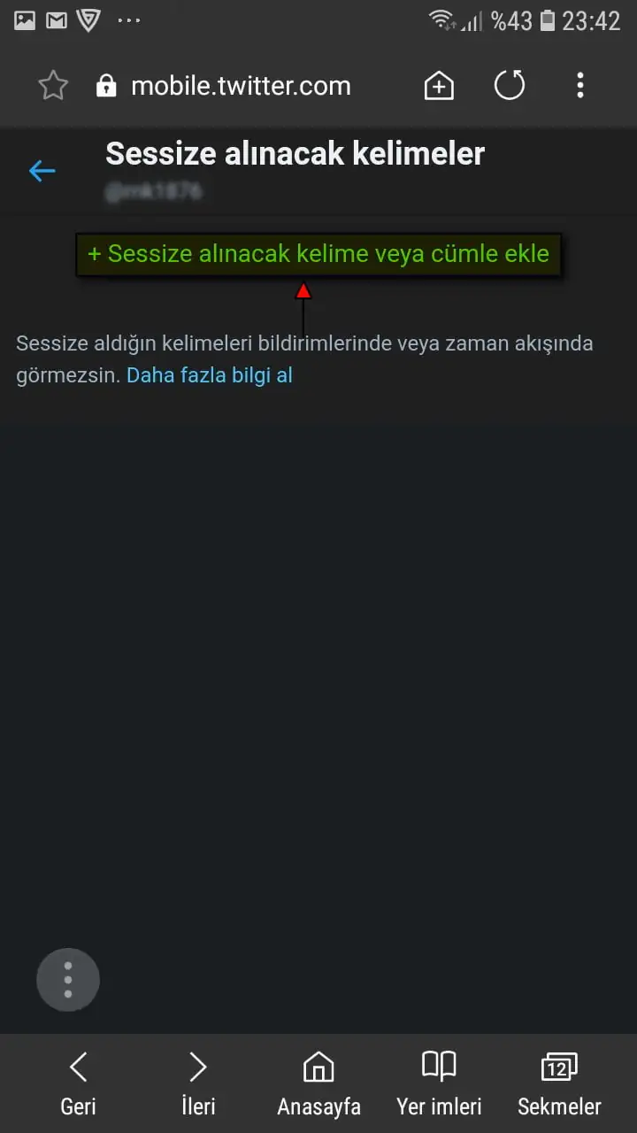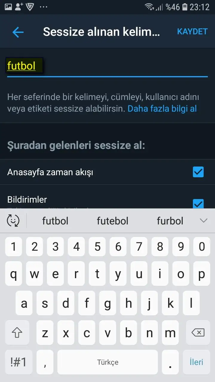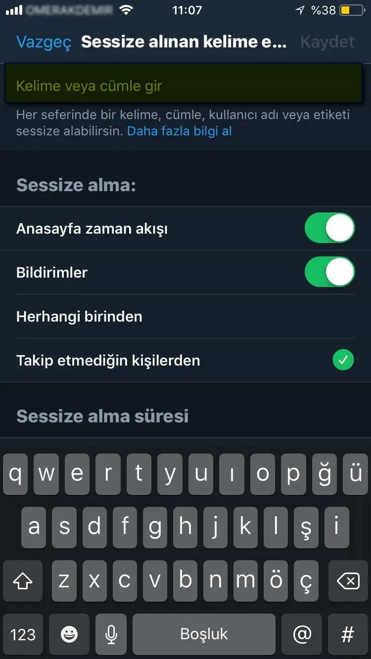 • Daha sonra bu kutucuğa, sessize almak (engellemek) istediğimiz kelimeyi yazıyoruz.