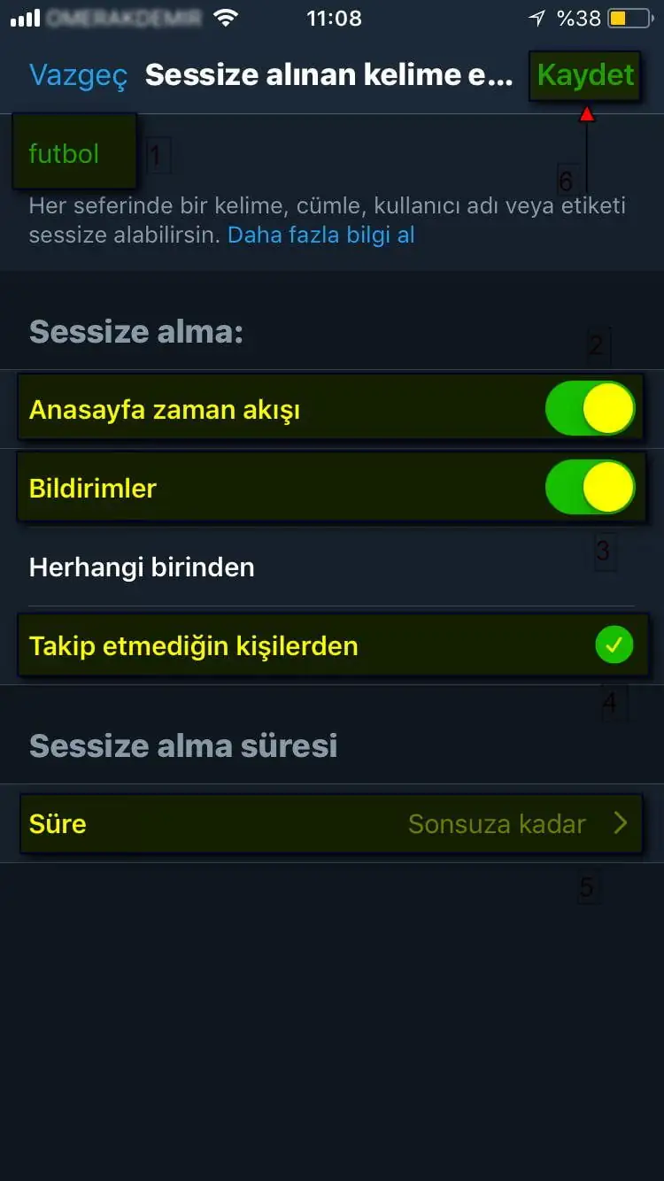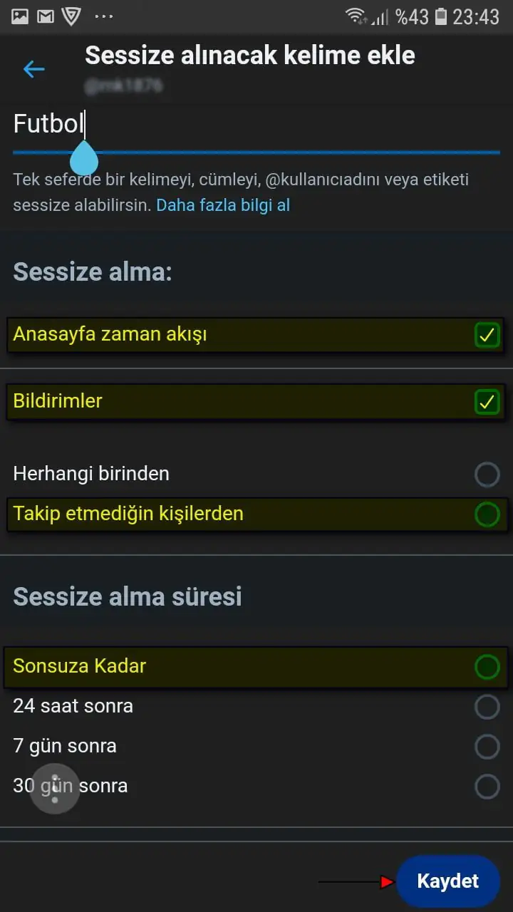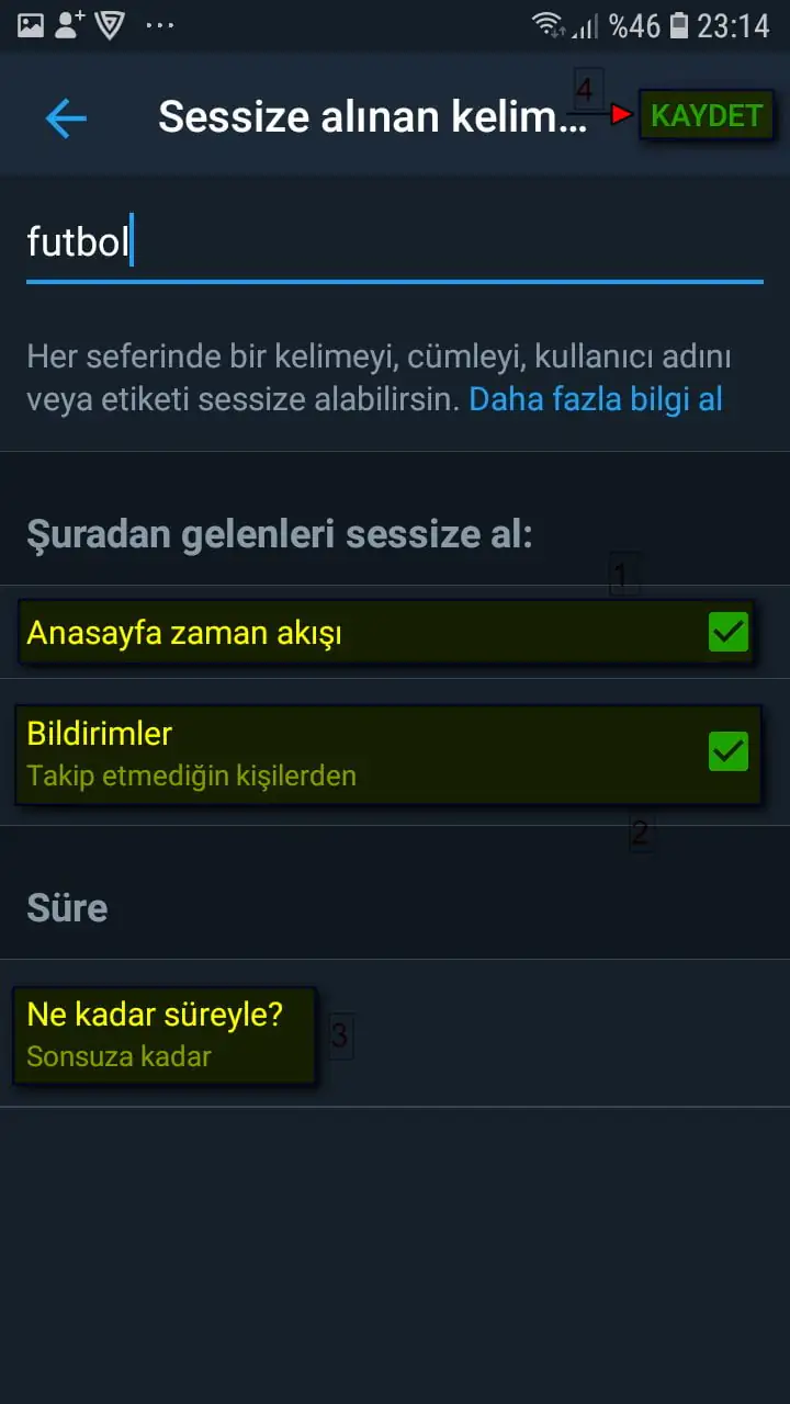 • Sessize almak (engellemek) istediğimiz kelimeyi yazıktan sonra, ‘Sessize alma:’ ve ‘Sessize alma süresi’ bölümlerinden tercihimize uygun seçenekleri aktif ediyoruz ve seçiyoruz ve daha sonra sayfanın sağ-üst kısmında bulunan ‘Kaydet’ butonuna dokunuyoruz.