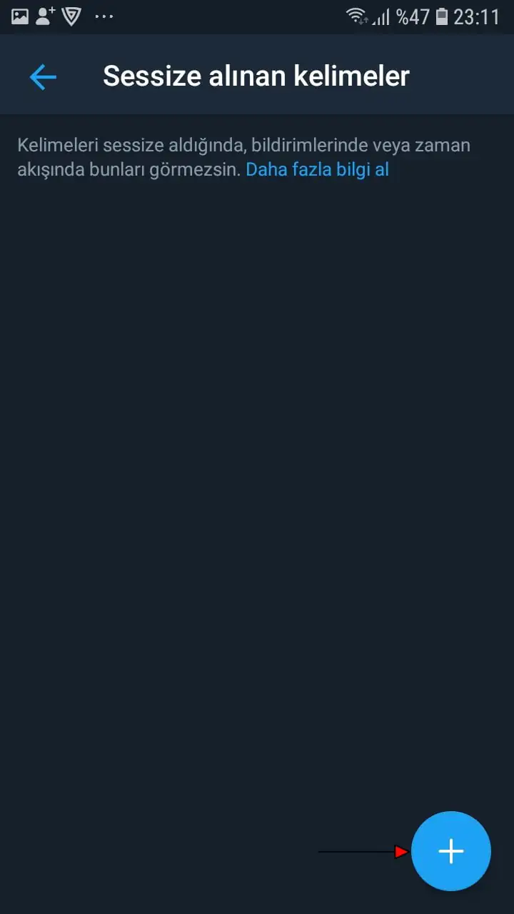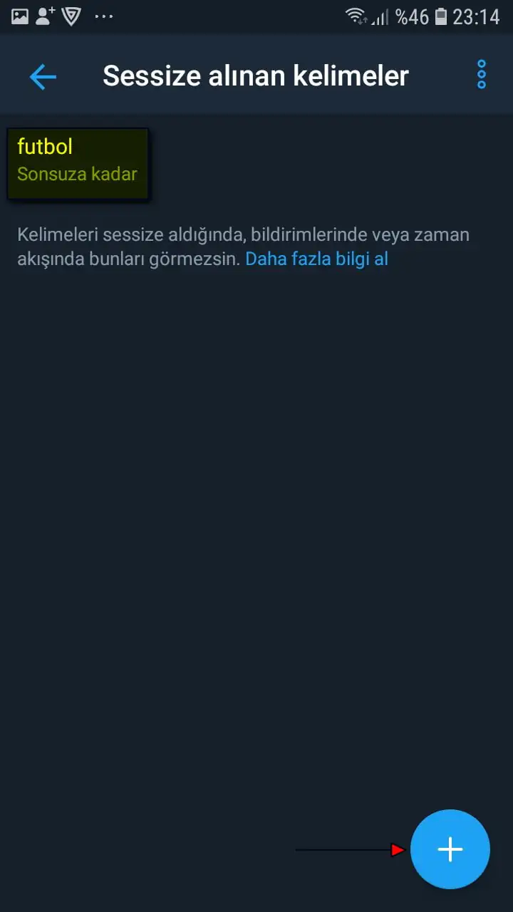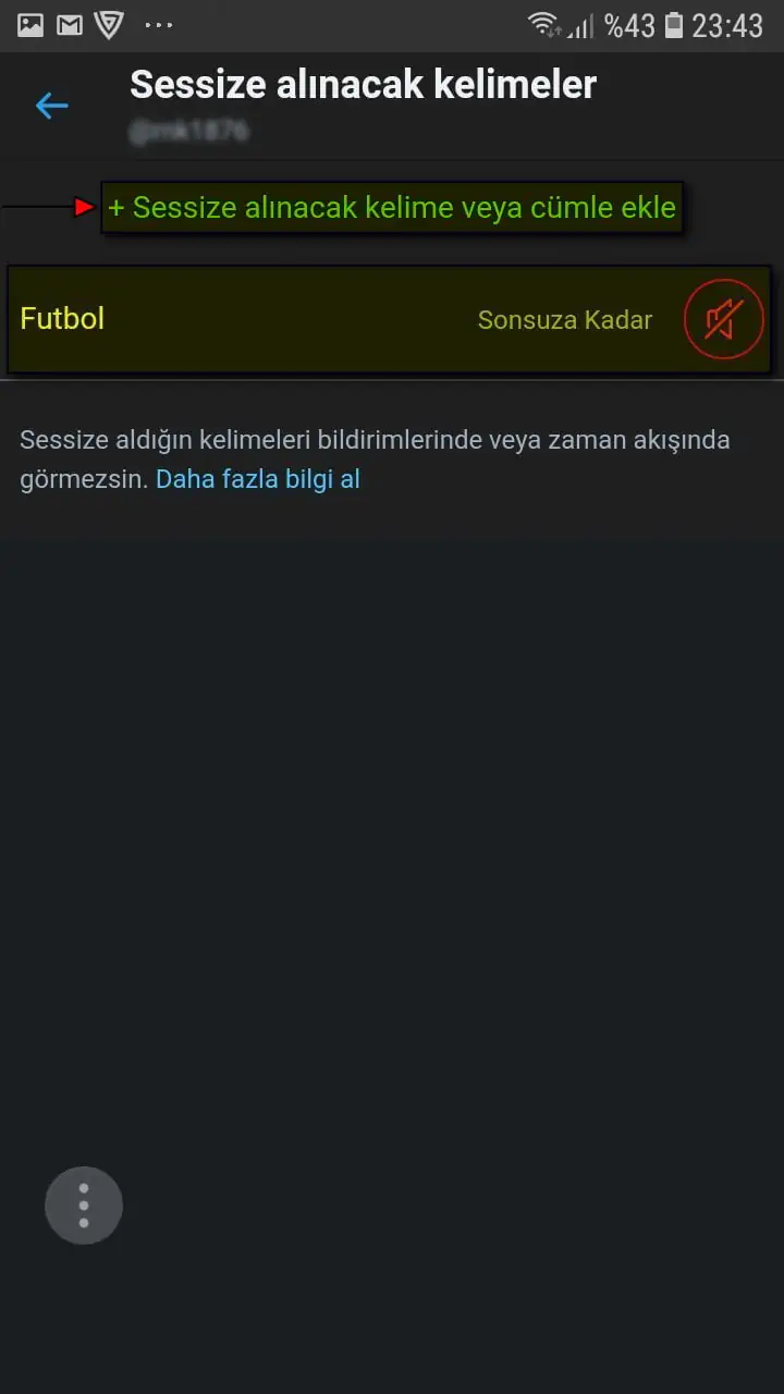 • Ve gelen sayfada sessize aldığımız (engellediğimiz) kelime, sessize alınan (engellenen) kelime listesine eklenmiş olacak. Sayfanın sağ-alt kısmındaki ‘+’ butonuna tıklayarak, eklemek istediğiniz başka kelimeleri veya cümleleri ekleyebilirsiniz.
