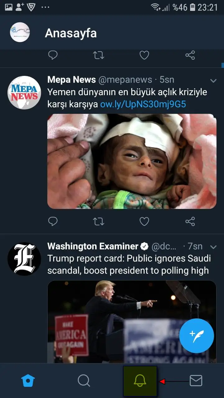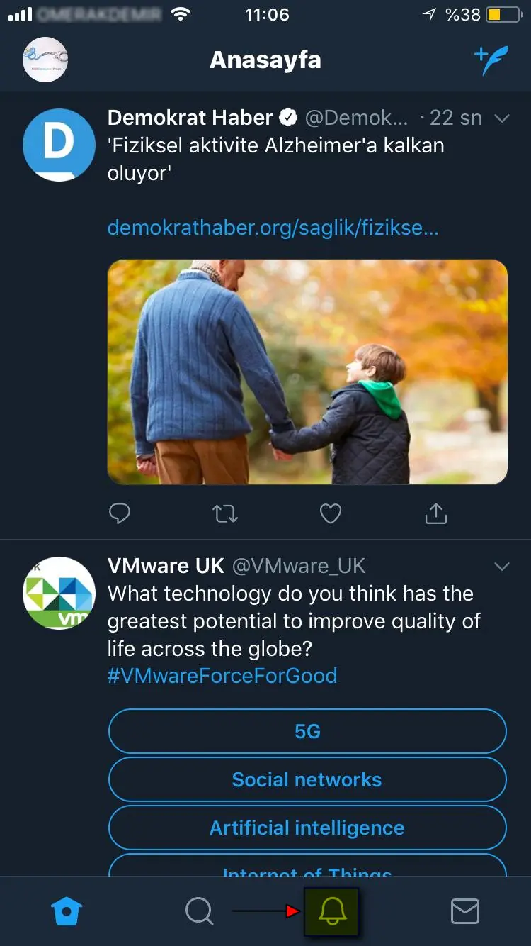 • Twitter uygulamasını açıp hesabımıza giriş yaptıktan sonra, ekranın alt kısmında bulunan ‘Bildirimler’ simgesine dokunuyoruz.