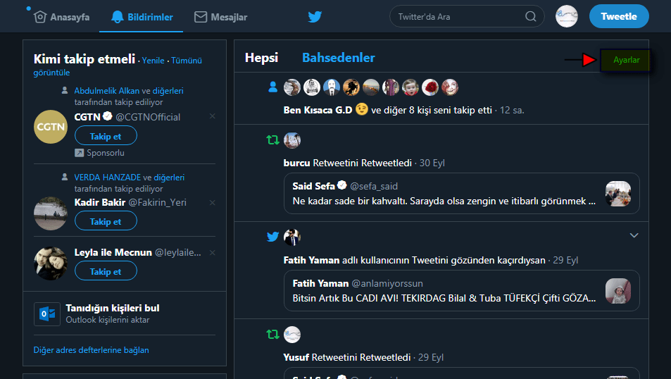 • Twitter hesabımıza giriş yaptıktan sonra ‘Bildirimler’ menüsüne tıklıyoruz.