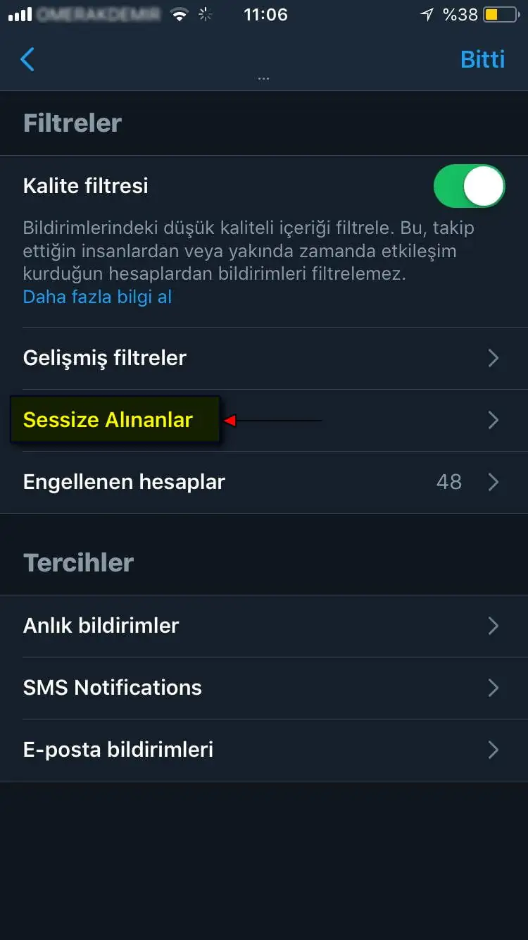 • Gelen sayfada ‘Sessize alınmış’ menüsüne dokunuyoruz.