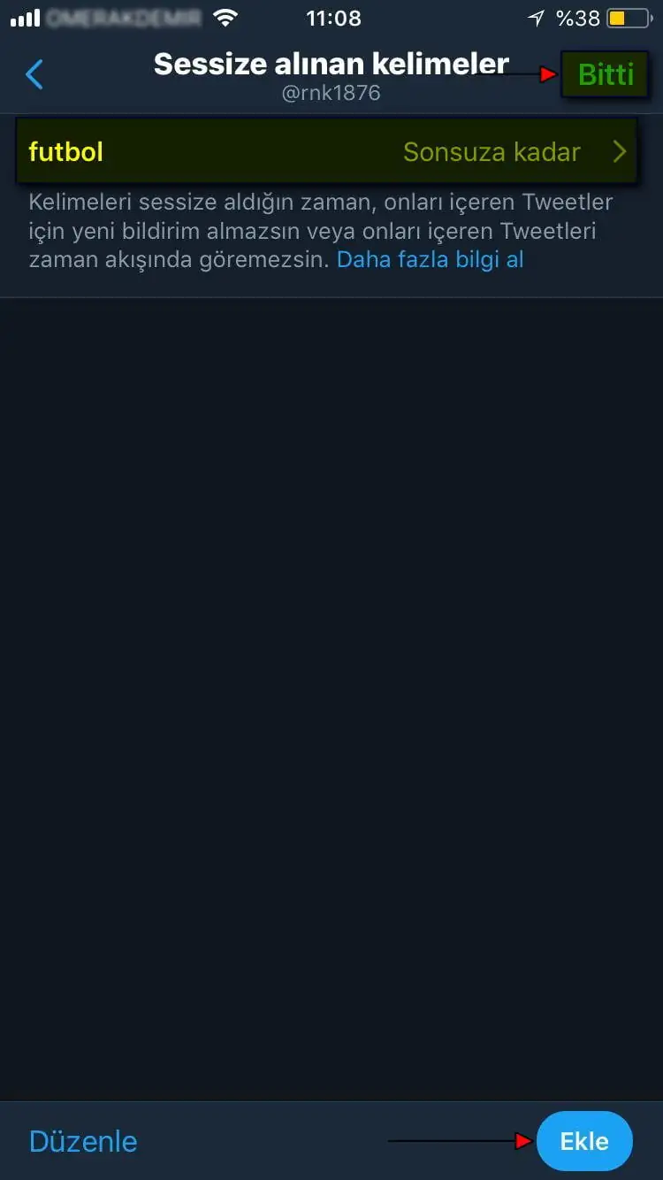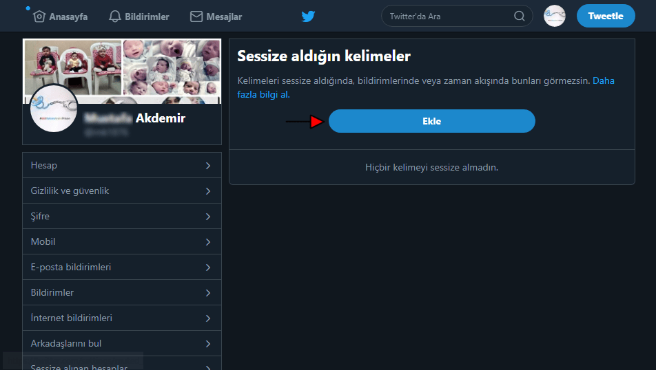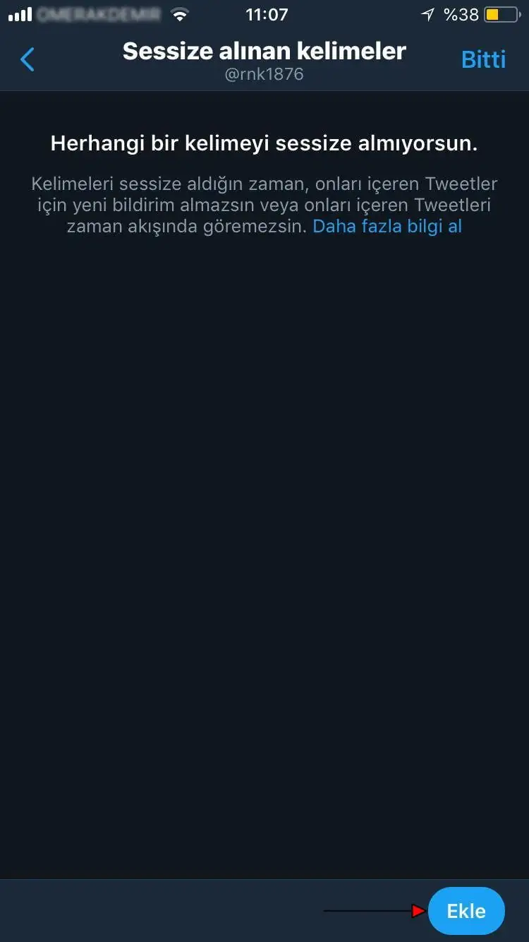• Ve gelen sayfada sessize aldığımız (engellediğimiz) kelime, sessize alınan (engellenen) kelime listesine eklenmiş olacak. Sayfanın sağ-alt kısmındaki ‘Ekle’ butonuna tıklayarak, eklemek istediğiniz başka kelimeleri veya cümleleri ekleyebilirsiniz.