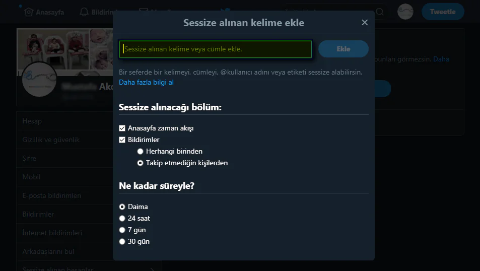 • Açılan pencerede ‘Sessize alınan kelime veya cümle ekle’ kutucuğuna, sessize almak istediğimiz bir kelime veya cümle yazıyoruz.
