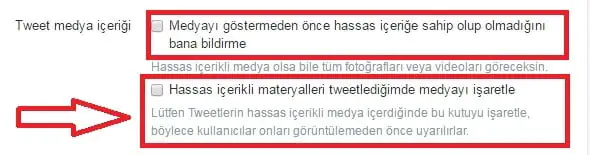 Aynı zamanda Tweet‘lerin hassas içerikli medya içeriğinde bu kutuyu işaretlemeniz durumunda kullanıcılar onları görüntülemeden önce uyarılırlar.