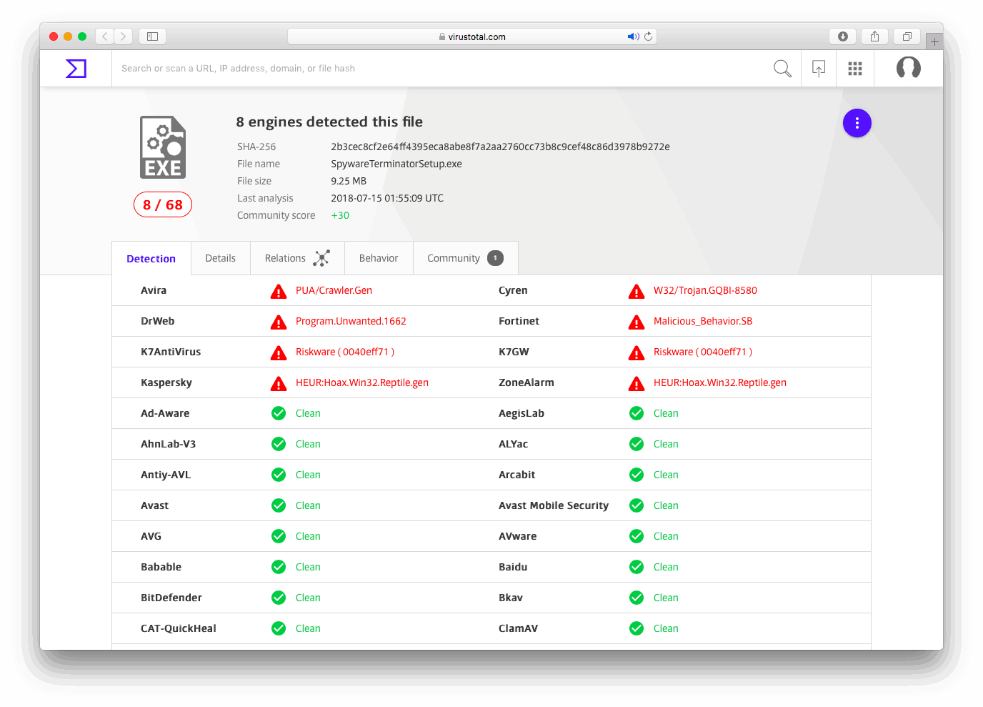 VirusTotal, sayısız motor kullanarak yüklediğiniz dosyaları tarar. VirusTutal tüm motorları eşit olarak sıralar. Karışık sonuçların anlaşılmasına yardımcı olmak için, diğer kullanıcıların bir dosyanın güvenliği konusunda nasıl oy kullandıklarını görür.