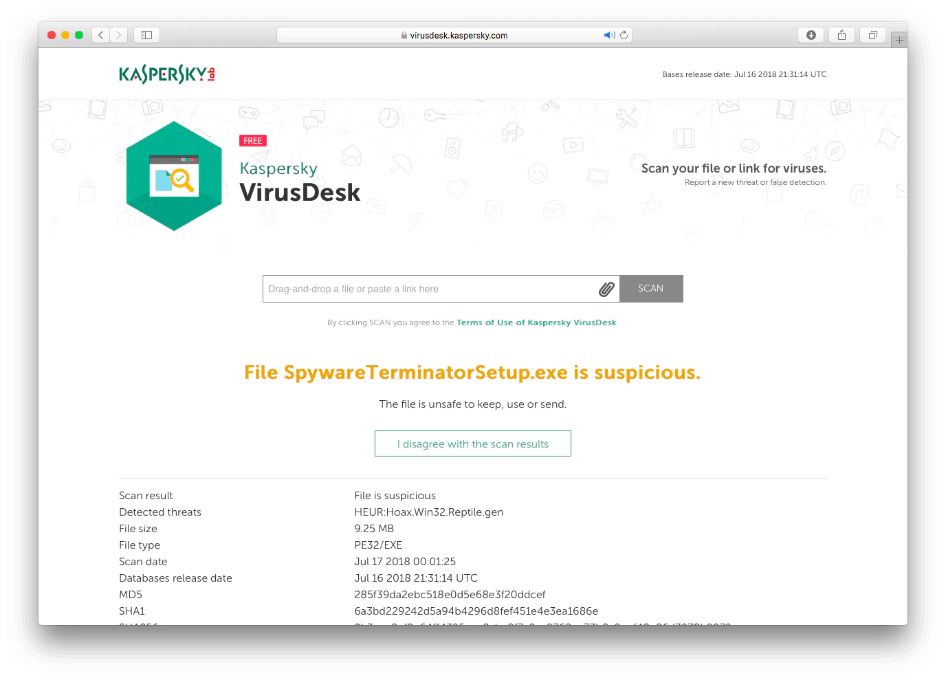 Bazı meta verilere ek olarak, Kaspersky VirusDesk, tespit edilen tehdit için bir kod da verir; ancak bu konuda daha fazla bilgi yoktur. Kasperky’nin taramasının ne getirdiğine katılmıyorsanız, örneğin bir dosyanın zararlı olduğuna ikna olduğunuzda, daha fazla analiz isteyebilirsiniz.