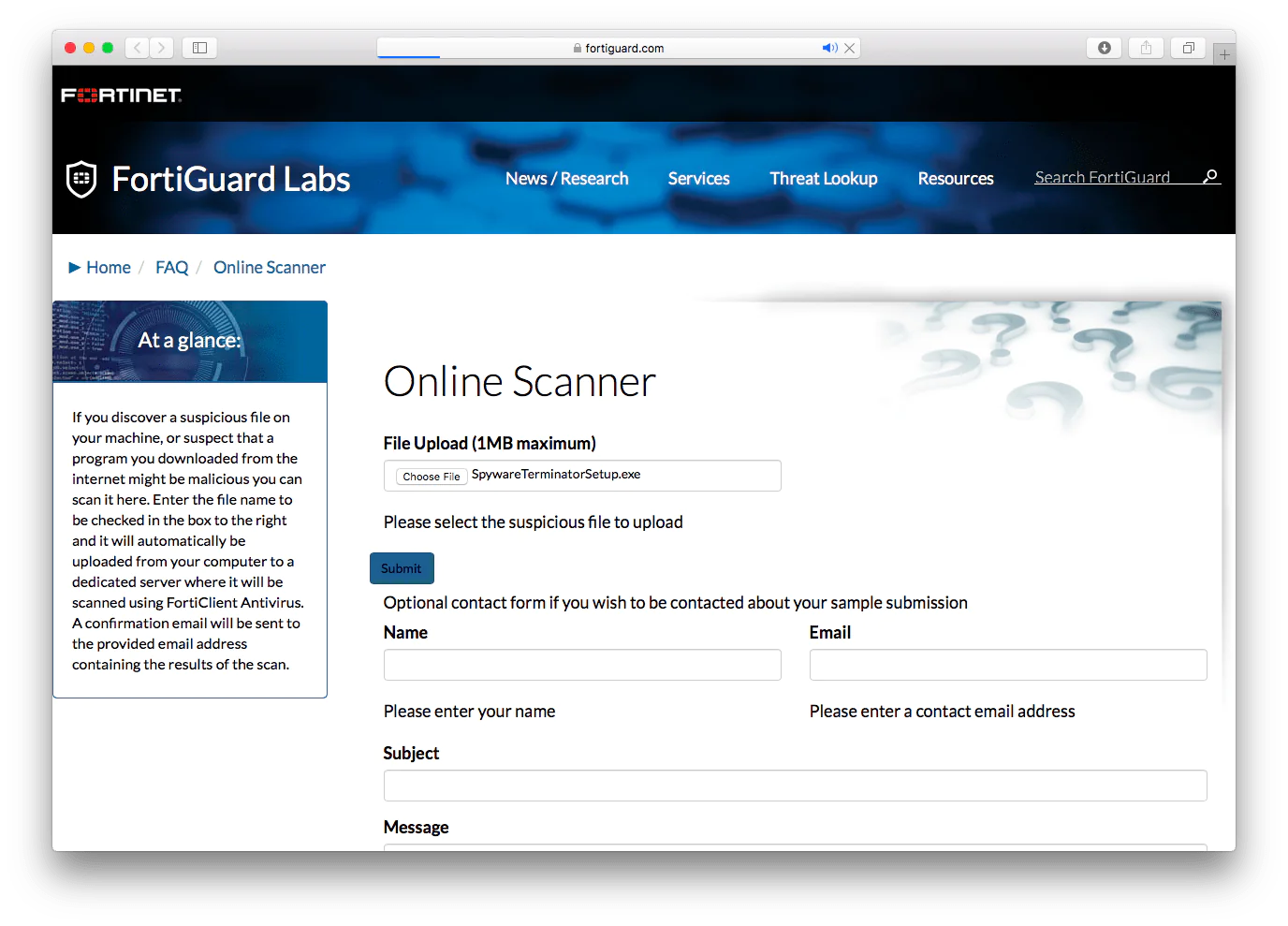 Maalesef, bu kısalık gönderebileceğiniz dosyalara kadar uzanır: boyutları ölçülebilir bir megabayt ile sınırlıdır. Şu ana kadar söylenenlerden bekleyebileceğiniz gibi, FortiGuard herhangi bir belgeyi tehlikeli veya güvensiz yapan şeyin ne olduğu hakkında daha fazla açıklama yapmıyor.