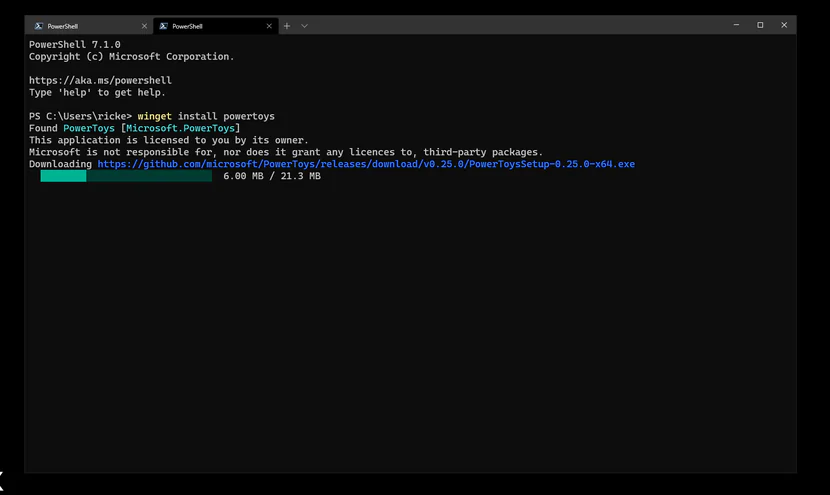 Bilmeniz gereken tek şey, paketin – uygulamanın adıdır. Aşağıdaki ekran görüntüsünde, PowerToys uygulamasını PowerShell‘e “winget install powertoys” komutunu girerek kurduk.