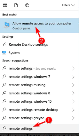 Ara’ya gidin, uzak ayarlar yazın ve Bilgisayarınıza Uzak bağlantılara izin ver’i açın.