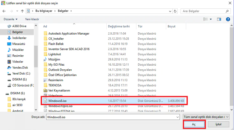 • İşletim sistemi yüklemek için Windows.iso disk kalıbını dosyasını cihaza göstermemiz gerekiyor.
