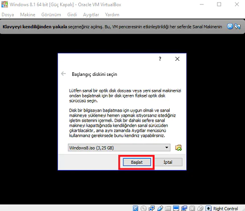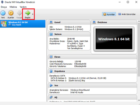 • Görüldüğü gibi yüzde dolduktan sonra aşağıdaki ekran karşımıza çıkıyor. Sanal makine hazır durumda, ‘Başlat’ butonuna tıklayalım.