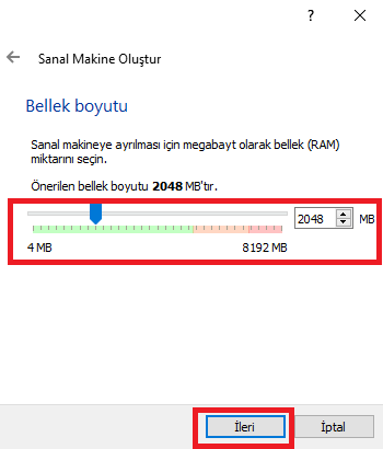 • Bellek (RAM) boyutunu belirleyelim. Bilgisayarınızın bellek miktarı yeterli ise sanal makine belleğini de yüksek tutabilirsiniz. Örneğin 16 GigaByte RAM’i olan bir bilgisayarınız var ise, 4 GigaByte RAM’i olan bir sanal makine oluşturabilirsiniz.