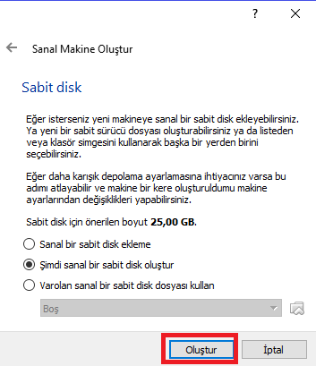 • Bir sonraki adımda ise makinenin sabit diskini oluşturmak için, ‘Şimdi sanal bir sabit disk oluştur’ seçeneğini işaretledikten sonra ‘Oluştur’ butonuna tıklayalım.